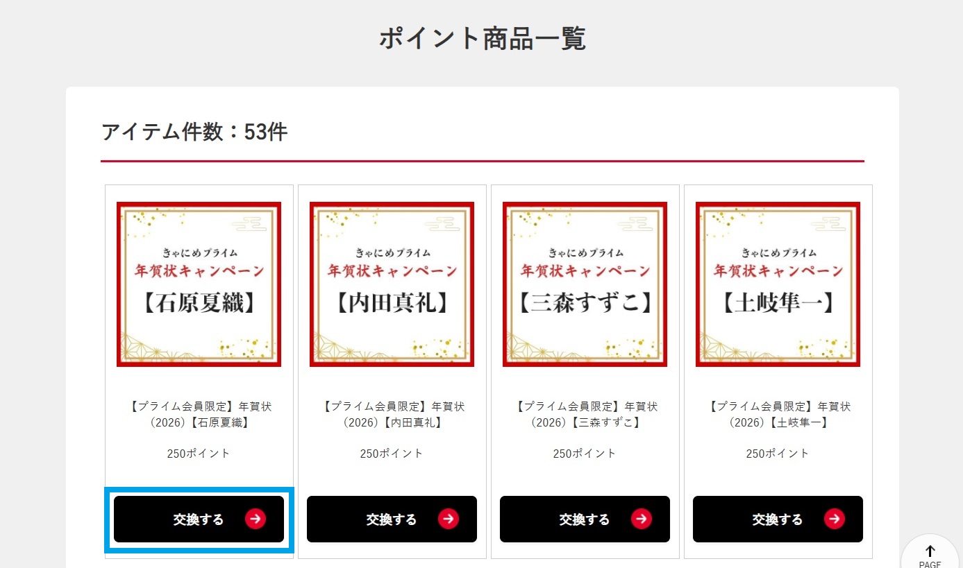 きゃにめマイページ内の【ポイント交換】>【ポイント商品交換】より交換をお申し込みいただけます。